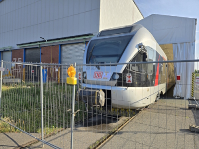 aktiven Industriegleis in Berlin-Reinickendorf zu sehen. Neben der Werkhalle stand der FLIRT 427 055 der Cantusbahn aus Hessen sowie der zweite Teil des FLIRT ET 4.38B der Go Ahead Bayern Bahn. Der erste Teil der Go Ahead Bayern Bahn (ET 4.38A) stand bereits in der Halle. Auf dem zweiten Gleis stand der FLIRT 429 545 der Hessenbahn. Kurzzeitig wurde der am 27.04.2021 angelieferten ET 312 der Byerischen Regiobahn aus der Halle geholt, um eine neu angelieferte BOGESTRA-Straßenbahn aus Bochum zu wiegen.